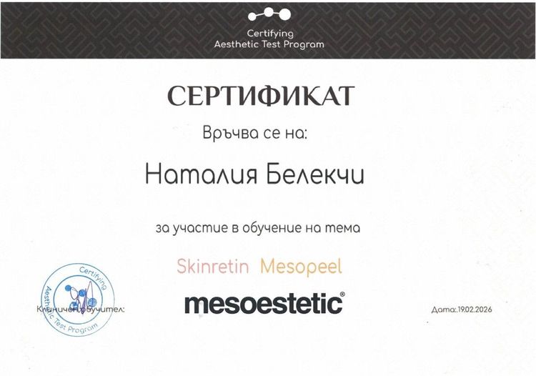 Нателла е професионалист, който поставя индивидуалния подход в основата на всяка терапия. Чрез внимателна диагностика и разбиране на нуждите на кожата, тя създава персонализирани схеми за ефективна грижа.
